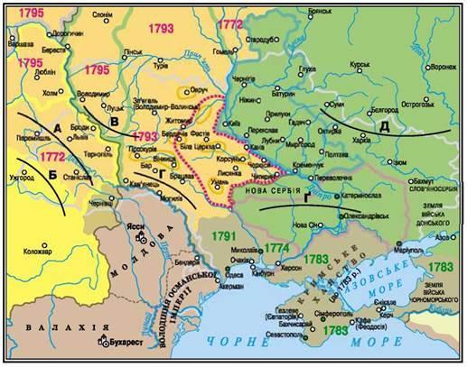 Розгляньте картосхему: • Територія яких держав позначена на картосхемі жовтим, світло-коричневим та зеленим кольорами? • Лінією якого кольору позначено терени Гетьманщини в часи скасування гетьманства й полкового устрою? • Якими буквами позначено українські землі, що належали Речі Посполитій, а після її поділу опинилися в складі Російської імперії? • Назвіть ці землі відповідно до букв. • Яку подію на картосхемі позначено замкненою пунктирною лінією червоного кольору? • Як на карті позначено міста, засновані в другій половині 18 ст. на півдні України?