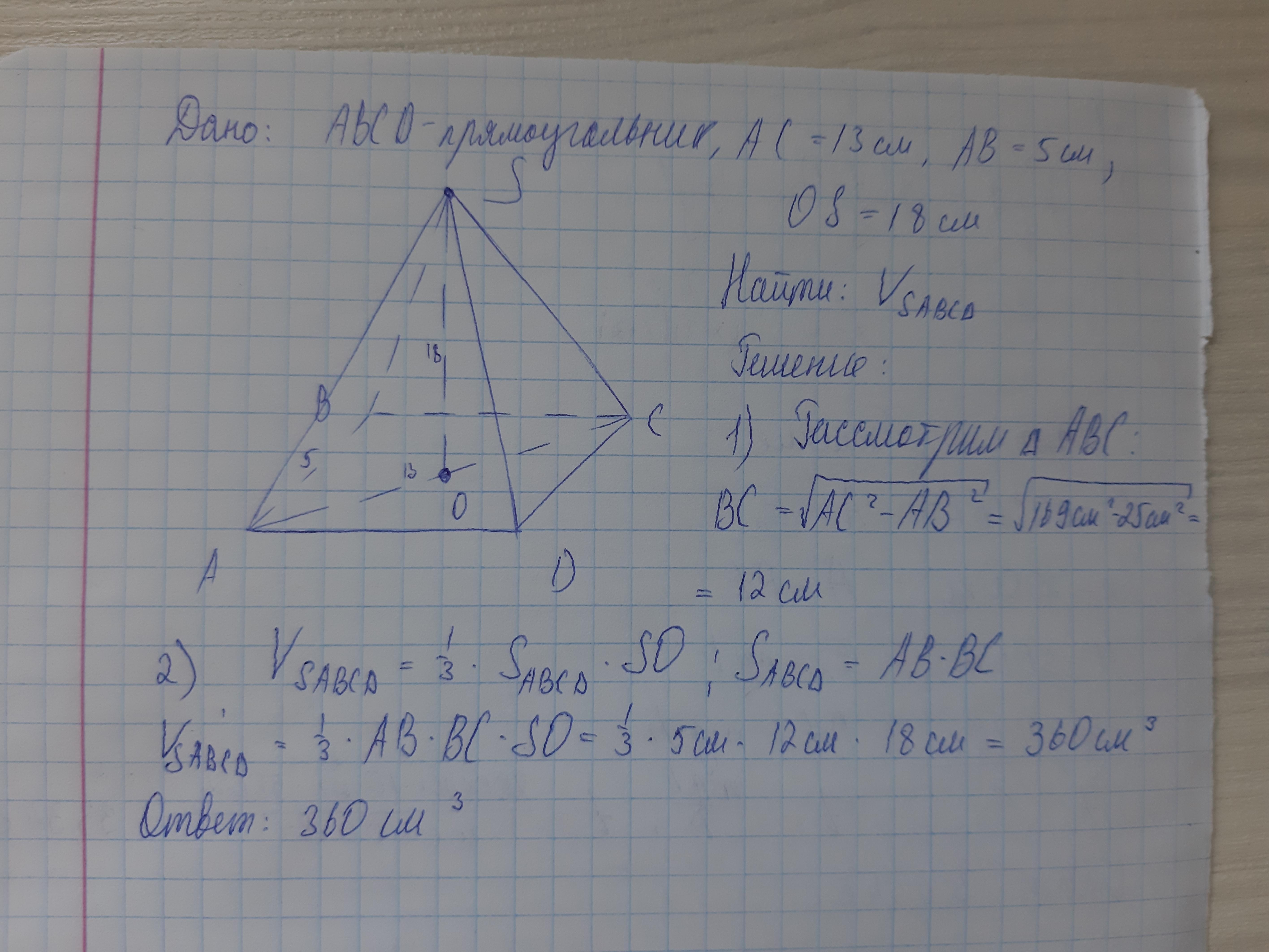 Найдите V пирамиды в основании которой находится прямоугольник с длиной диагонали 13см и стороной 5см, а длина высота пирамиды 18см