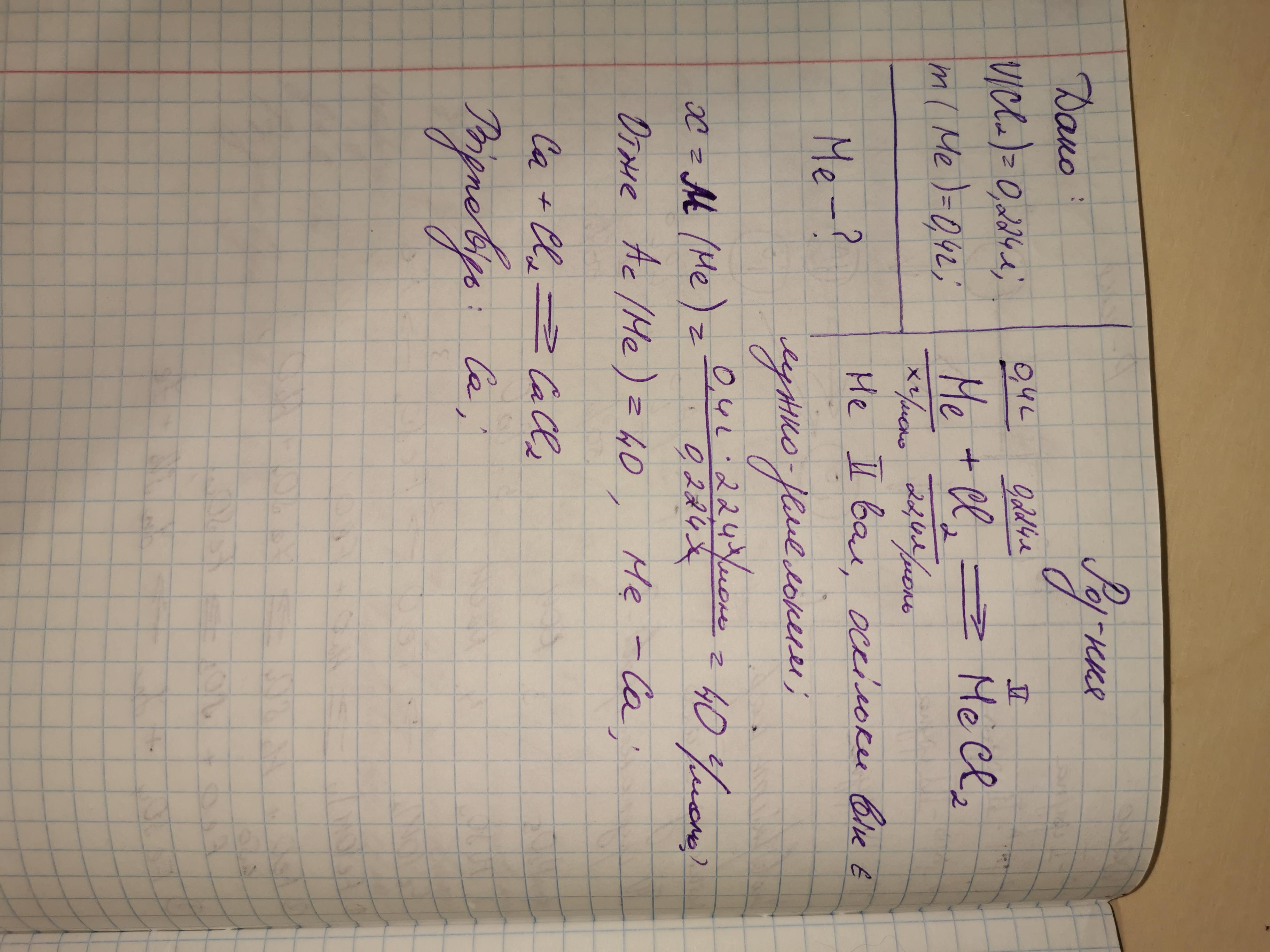 Хлор об'ємом 0,224 л (н.у.) повністю прореагував з лужноземельним металом масою 0,4г. Назвіть цей метал.