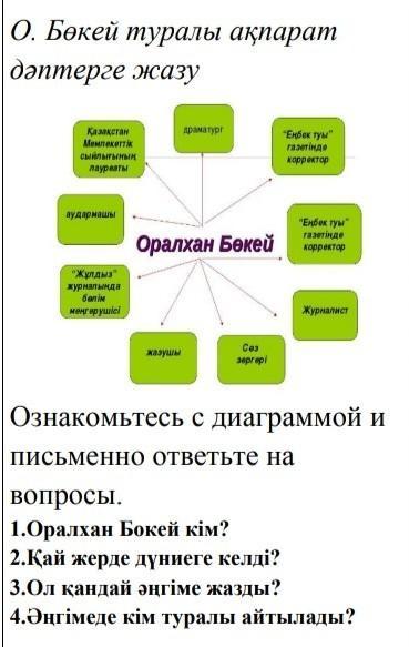 1. Оралхан Бокей кім? 2. Қай жерде дүниеге келді? 3. Ол қандай әңгіме жазды? 4. Әңгімеде кім туралы айтылады?
