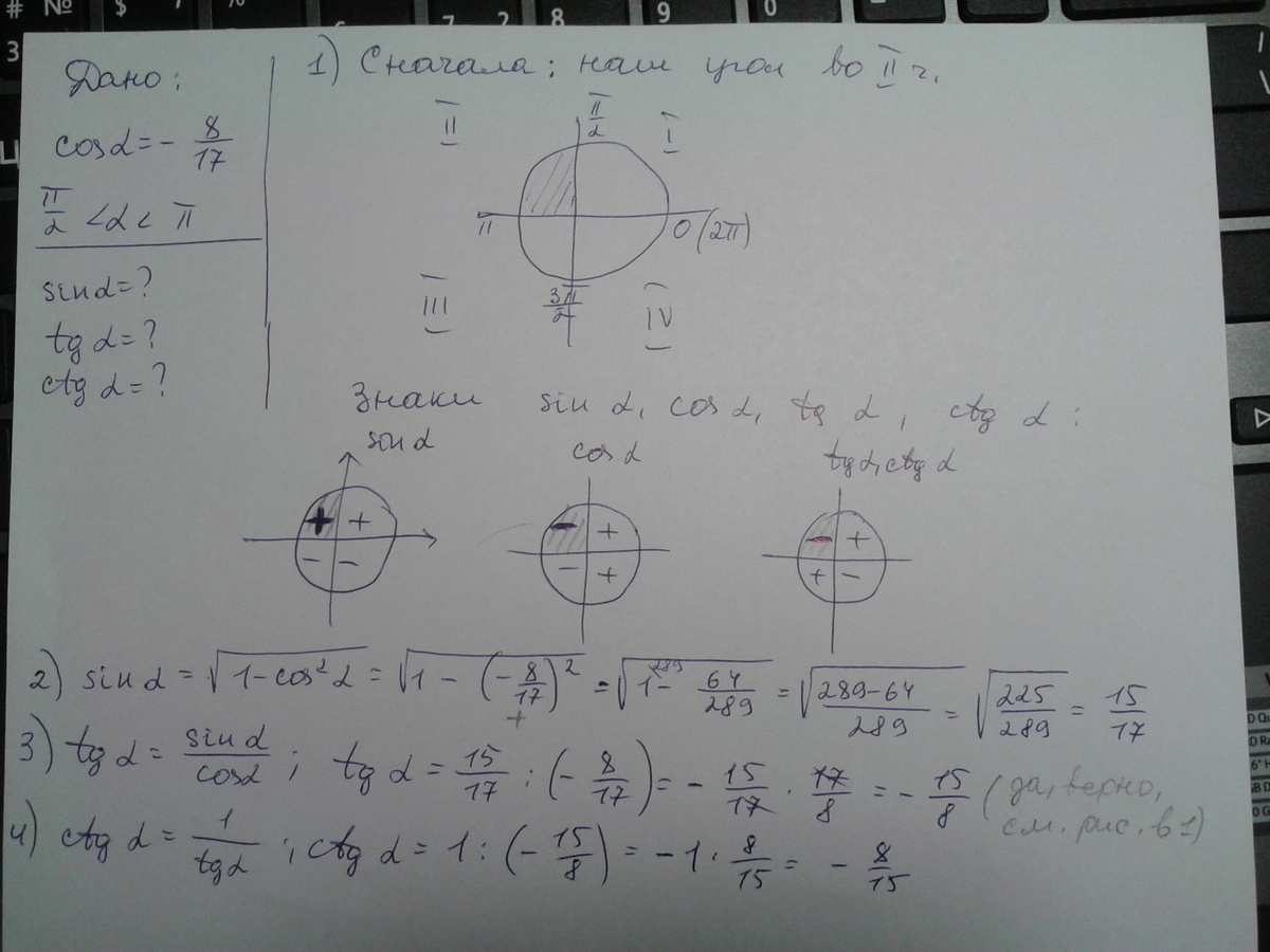 Сначала опр. четверть,где находится наш угол(заштриховываем её).Затем по формулам считаем функции.Если всё правильно сделали,то знаки будут совпадать с теми,которые мы отметили.