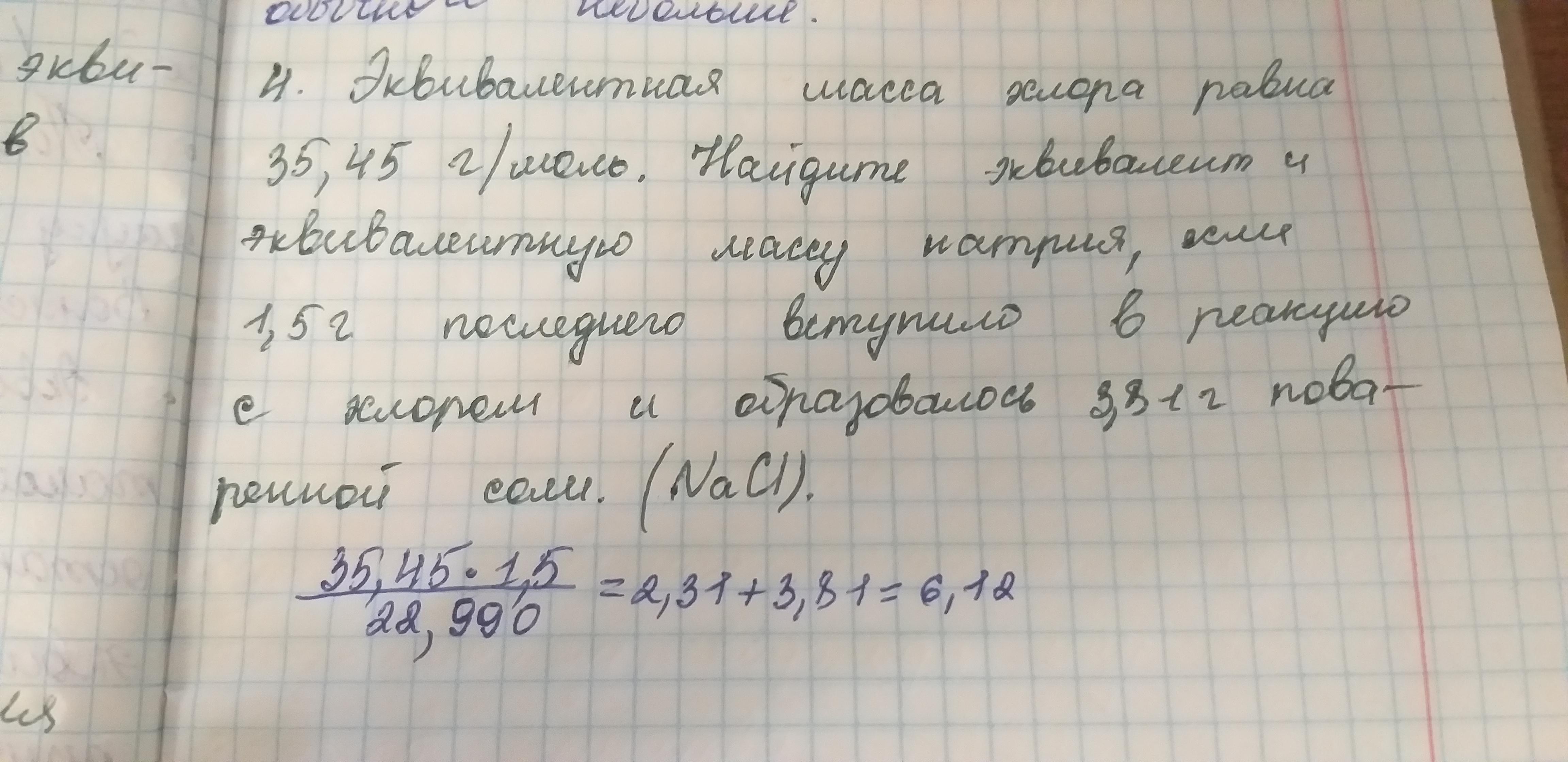 эквивалентная масса хлора равна 35,45 г/моль. найдите эквивалент и эквивалентную массу натрия,если 1,5 грамма,последнего вступило в реакцию с хлором и образовалась 3,81 грамм поваренной соли