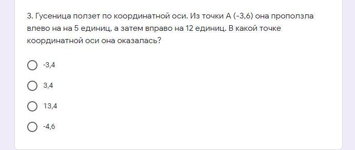 Гусеница сначала находилась на точке А(-3,6), потом проползла в лево на 5 единиц, это значит, что к 3,6 надо прибавить 5(только минус считать не надо, а надо будет его приписать к ответу) и получаем -8,6, затем гусеница проползла на право 12 единиц, это значит, что из 12 надо вычесть 8,6(минус не считаем) и получаем 3,4(только без минуса).