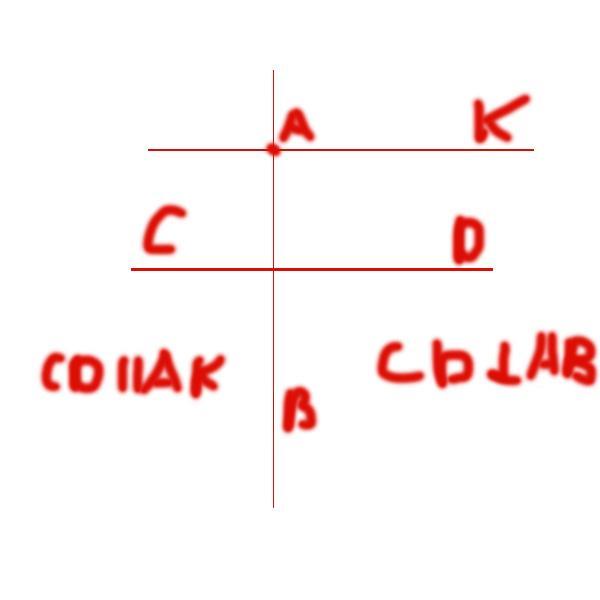 Побудуй пряму CDвибери точку A поза прямою.За допомогою лінійкі та косинця побудуй пряму AB перепендикулярну до прямої CD , та пряму AK паралельну парарельну прямій CD