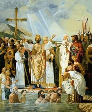 Крещение Руси . Князь Владимир в 988 году крестил людей в Киеве в реке Днепр. Именно в Днепре было совершено первое крещение народа на Руси.
