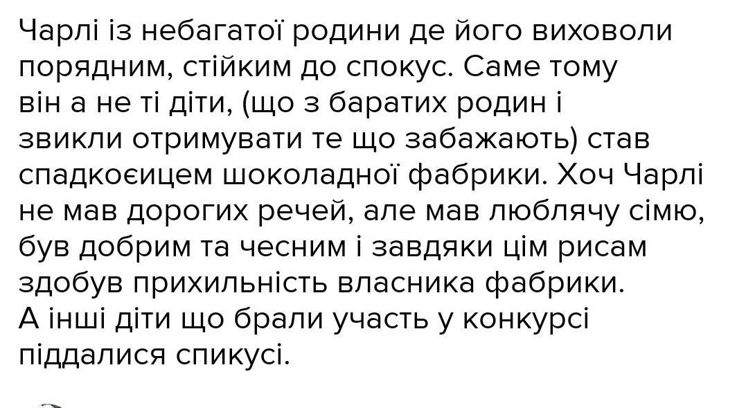 Срочно пж пж пжПисьмово (у вигляді розгорнутої відповіді – 5-10 речень довести, що Чарлі заслужено став спадкоємцем власника шоколадної фабрики Віллі Вонка.