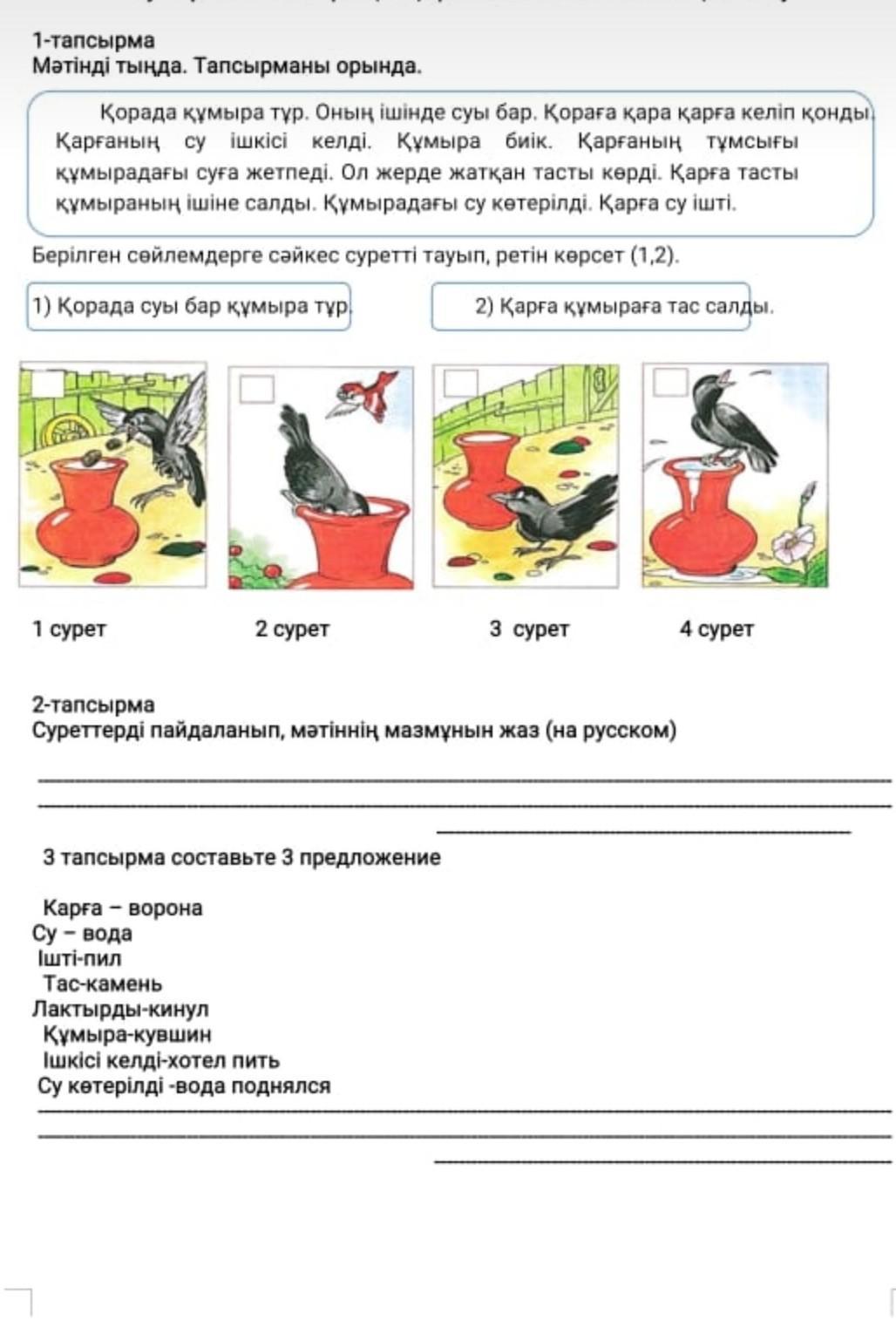 Қарға су ішкісі келді. Ол су ішу үшін құмыраға тас салып суды кобейтіп ішті.