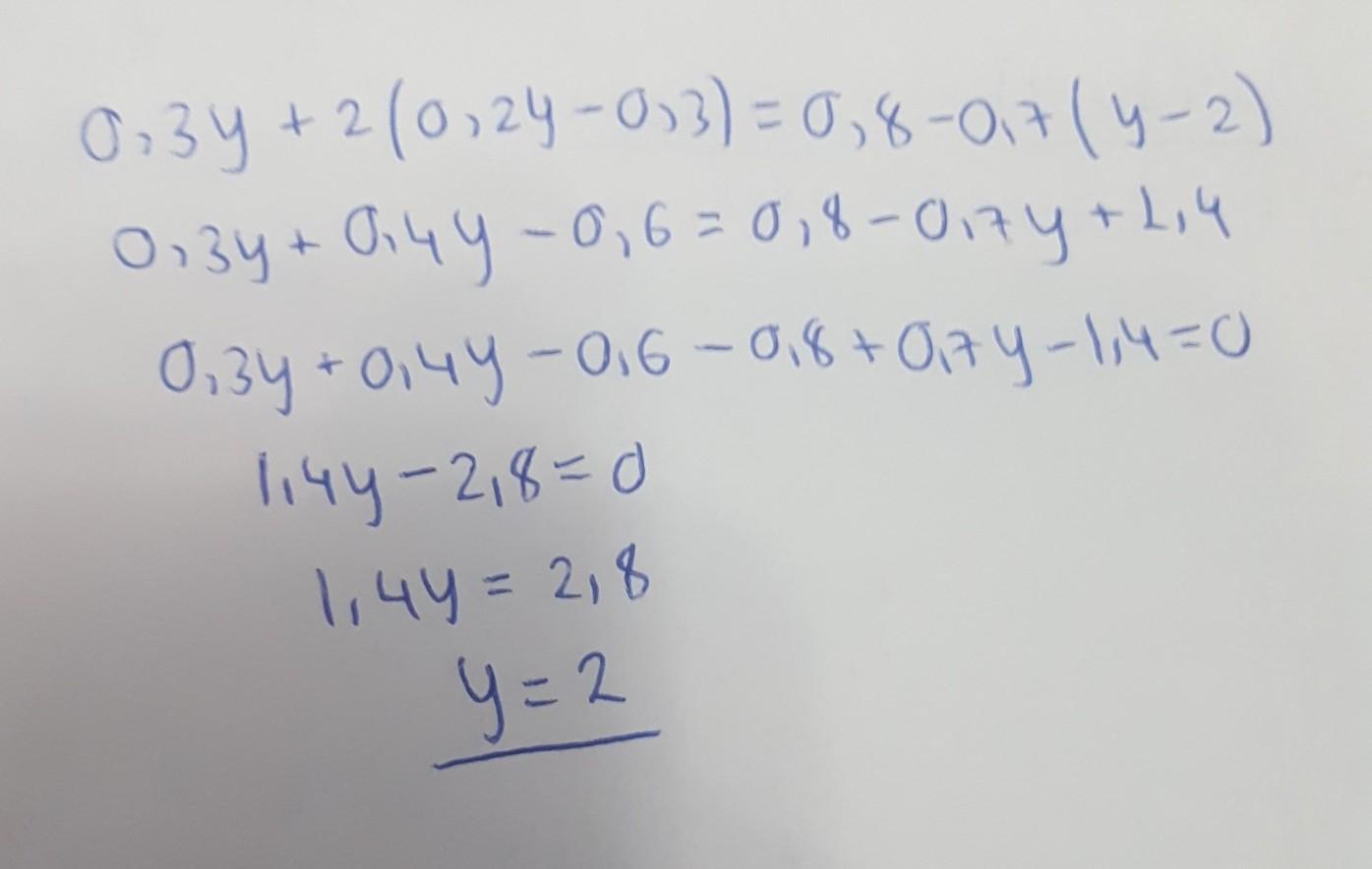 0,3у + 2(0,2у - 0,3) = 0,8 - 0,7(у - 2)