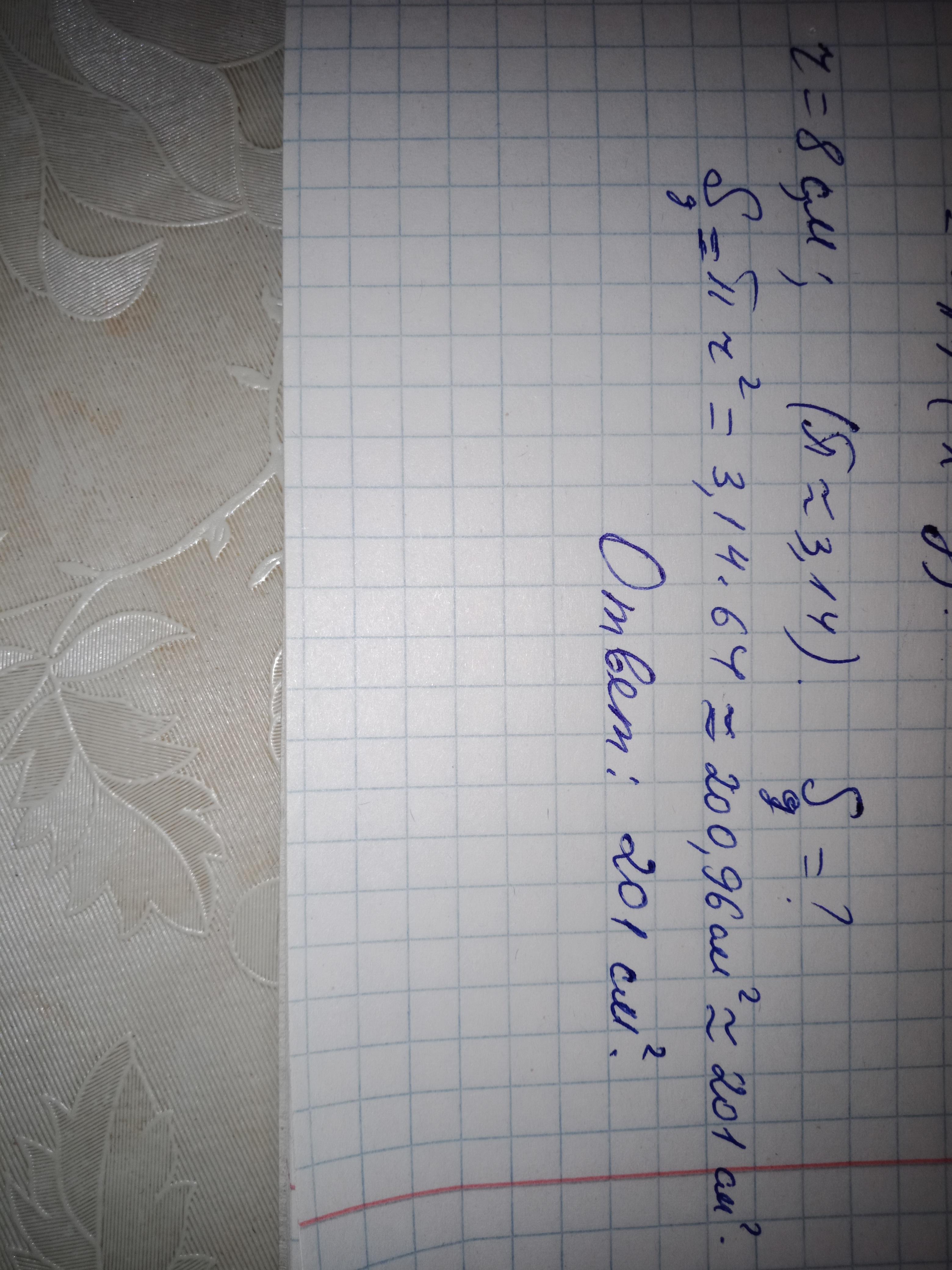 S=пR2 (R в квадрате) 8*8=64 3.14*64=200,96 200,96=примерно 201,0