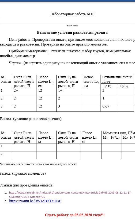Выяснение условия равновесия рычага лабораторная работа 7 класс срочно кину ещё 100 кто правильно сделает