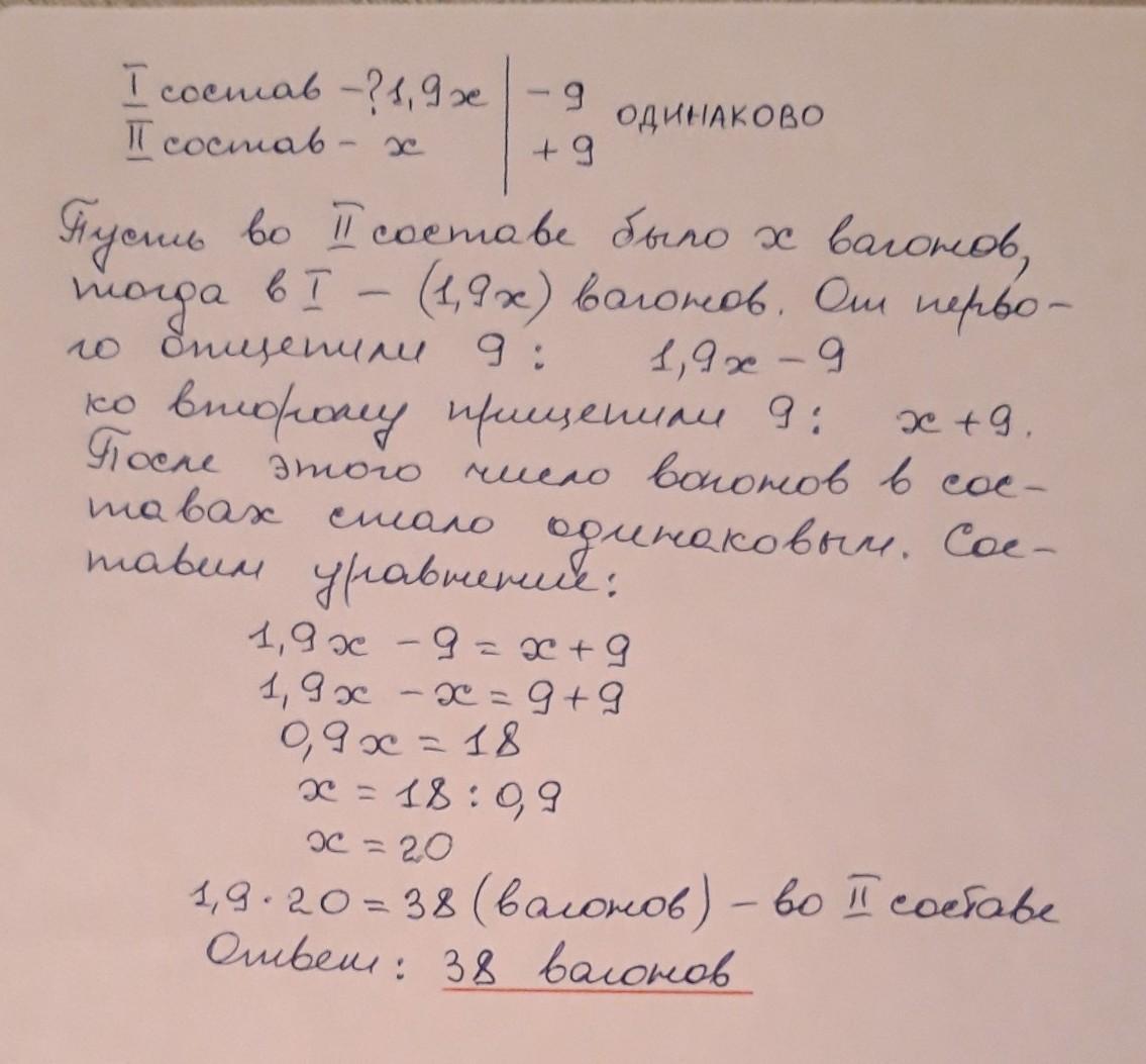 При комплектовании составов поездов первый состав оказался в 1,9 раза длиннее второго. Чтобы уравнять число вагонов в обоих поездах, от первого состава отцепили 9 вагонов и прицепили их ко второму. Сколько вагонов было в первом составе первоначально?