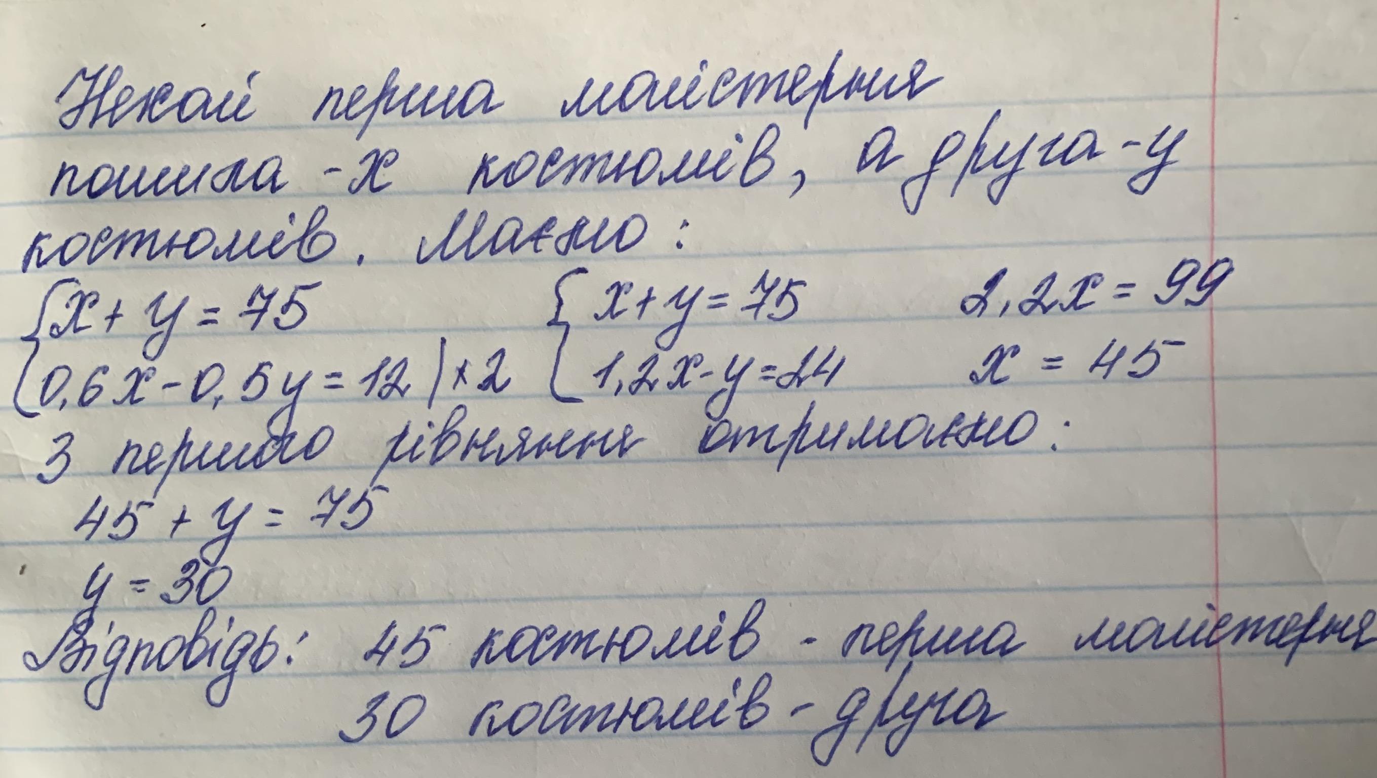 Дві майстерні мали пошити 75 костюмів. Коли перша майстерня виконала 60% замовлення, а друга - 50%, то виявилося що перша майстерня пошила на 12 костюмів більше ніж друга. Скільки костюмів мала пошити кожна майстерня?