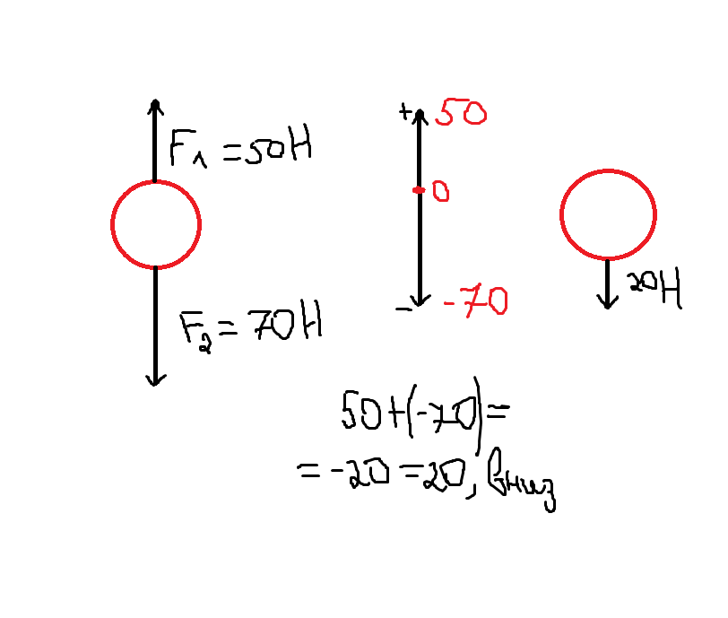 на тело действуют две силы: F1, направленная вверх, и F2, направленная вниз. F1=50 H, F2=70 H. найдите равнодействующую этих сил. ответ обоснуйте.