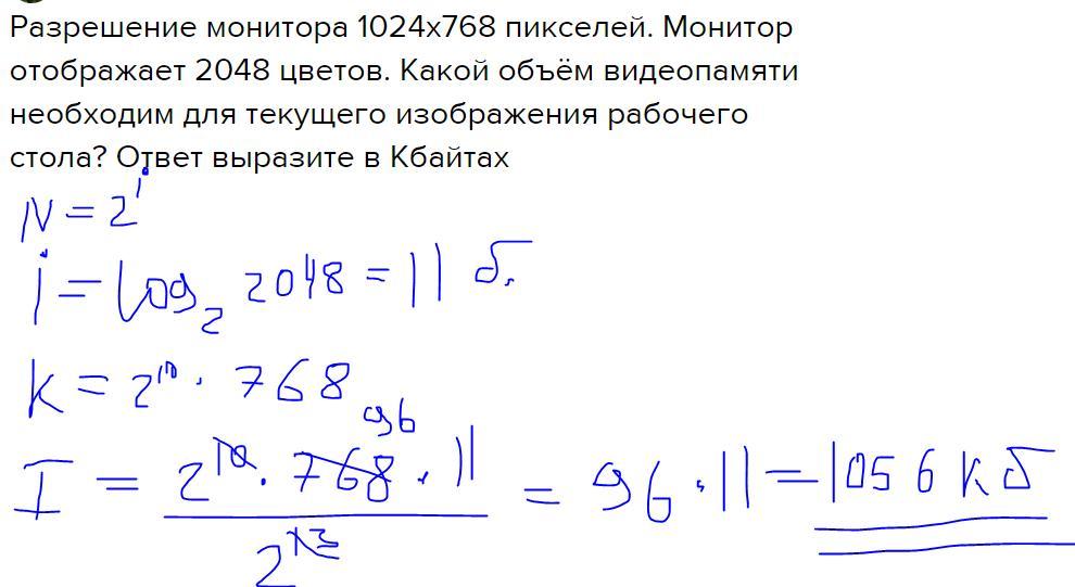 Разрешение монитора 1024х768 пикселей. Монитор отображает 2048 цветов. Какой объём видеопамяти необходим для текущего изображения рабочего стола? Ответ выразите в Кбайтах