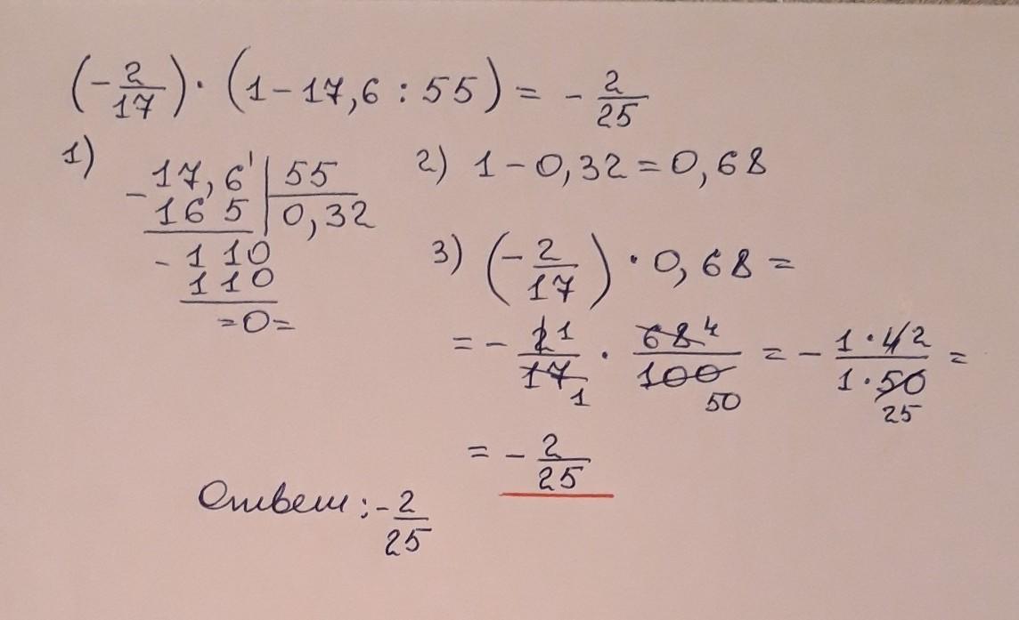 3)(-2/17)*0,68=-2/17*68/100=-2/17*17/25=-2*1/25=-(2/25)