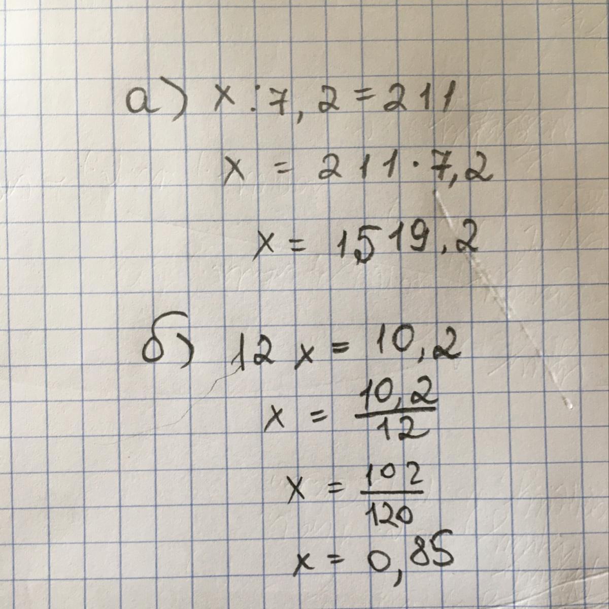 а) х : 7,2 = 211 б) 12 · х = 10,2