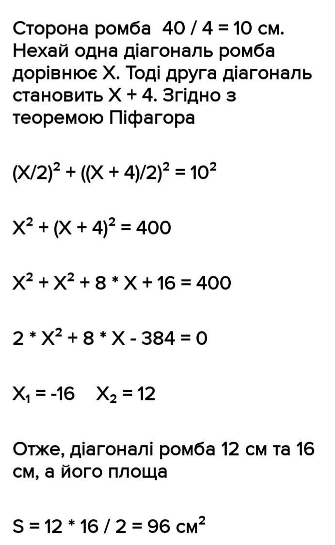 Відповідь 96 тому що можна ромб ділимо на чотири трикутника находимо один катети множим га два і за формулою находимо площу
