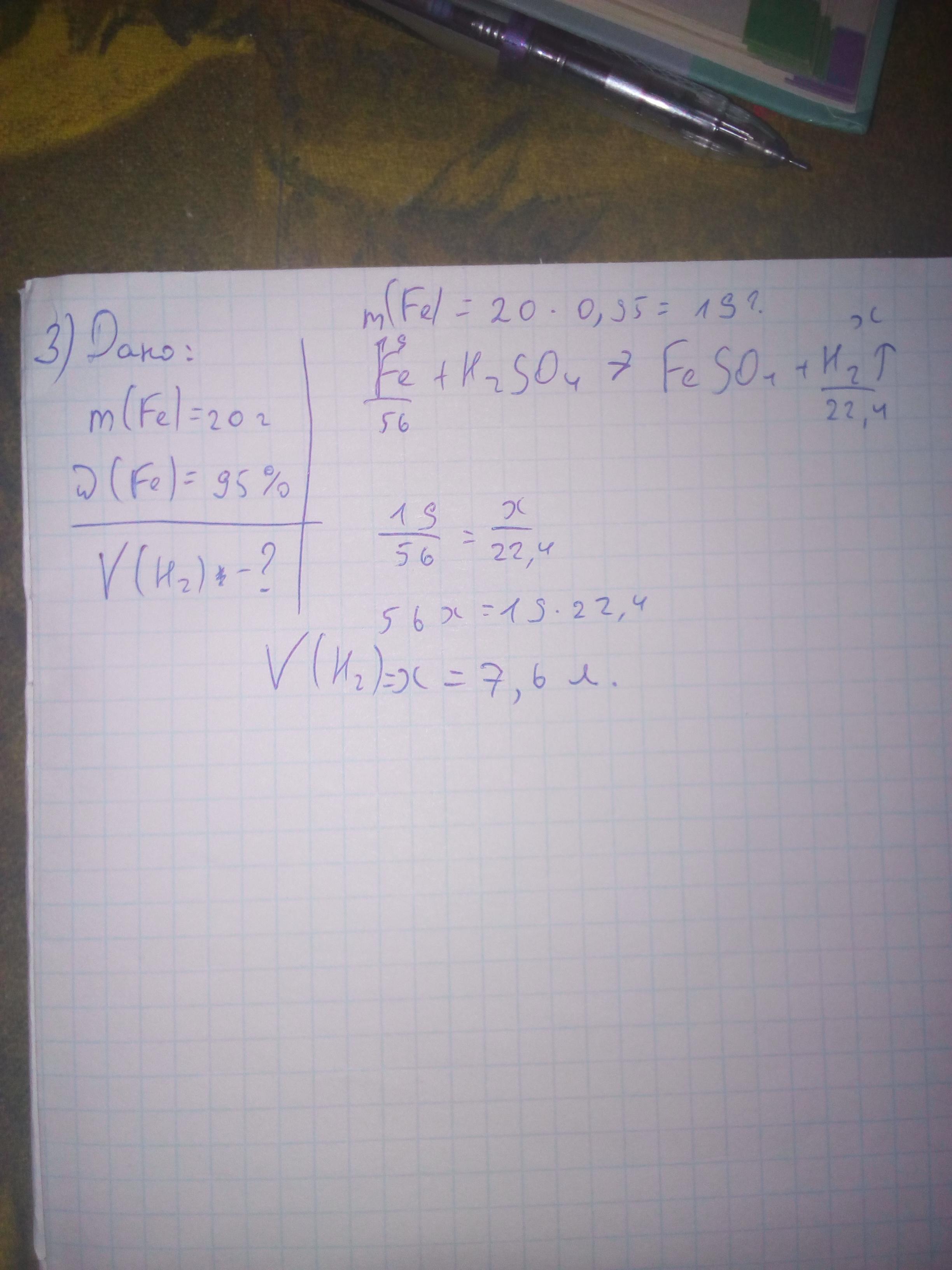 3. Найти объем водорода при действии раствором серной кислоты на 20г железа,