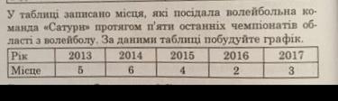 у таблиці записано місця де посідала волейбольна команда "Сатури", протягом п'яти останніх чемпіонатів області з волейболу. За данними таблиці побудуйте графік