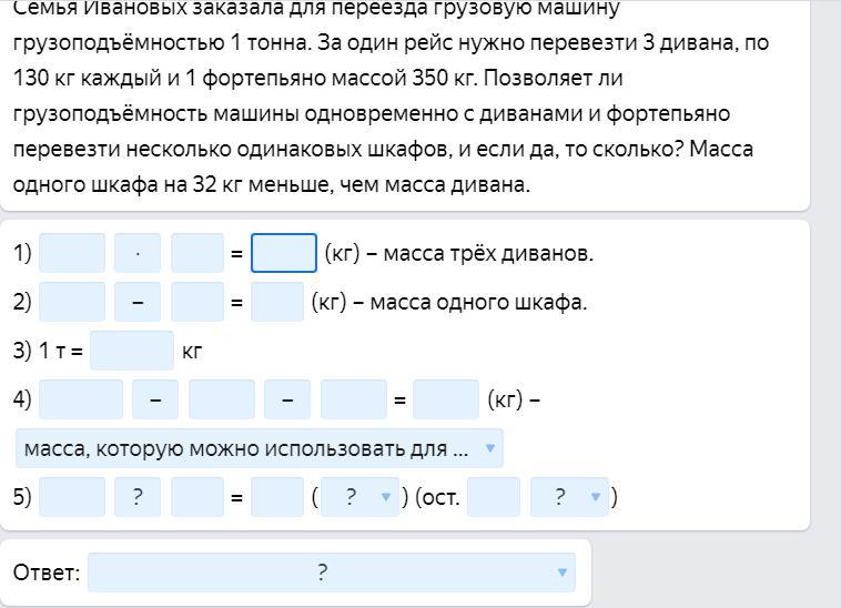 Семья Ивановых заказала для переезда грузовую машину грузоподъёмностью 1 тонна. За один рейс нужно перевезти 3 дивана, по 130 кг каждый и 1 фортепьяно массой 350 кг. Позволяет ли грузоподъёмность машины одновременно с диванами и фортепьяно перевезти несколько одинаковых шкафов, и если да, то сколько? Масса одного шкафа на 32 кг меньше, чем масса дивана.