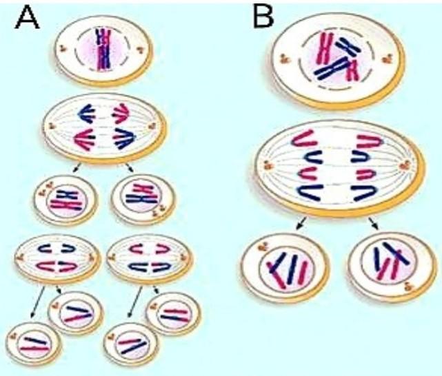 1. На рисунке изображены схемы процессов митоза и мейоза.