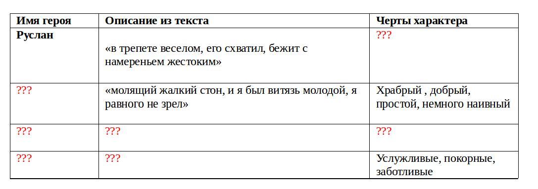 Задание 2. Прочитайте отрывок из поэмы А.С.Пушкина. Заполните пустые клетки таблицы текстом: имена персонажей, чертами характера персонажей..