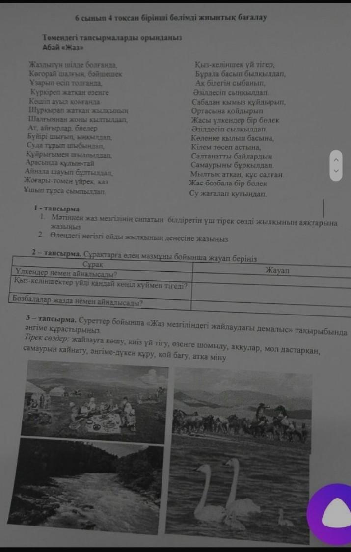 Ответ:1-тапсырма:1)көгорай шалғың бәйшешек,шалғынның жоны,су жағалап қутыңдап.2)негізгі ой:Жаз келегендегі айналаның өзгеруі яғни,сипаты.2-тапсырма Үлкендер:далада отырып әзілдесіп,самаурыннан шәй ішіп отыр