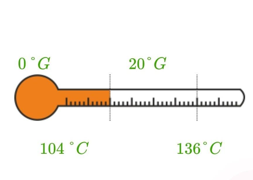 Григорий решил удивить друзей своей выдумкой, придумав новую температурную шкалу, в которой температура измеряется в градусах Гения (°G). Он её привязал к температурной шкале Цельсия таким образом, что t1°G=0°G соответствует t1°C=104°C, а t2°G=20°G соответствуют t2°C=136°C (см. рис.). Чему равна температура плавления (таяния) олова по шкале Гения tk°G, если по шкале Цельсия она равна tk°C=232°C?
