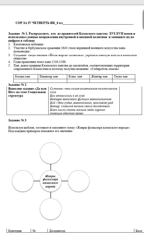 Задание № 1. Распределите, кто из правителей Казахского ханства XVI-XVII веков и использовал данные направления внутренней и внешней политики и запишите их по цифрам в таблицу