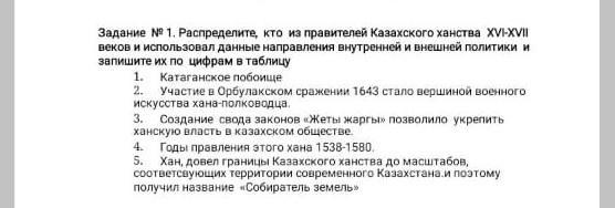 Задание 1 Распределите Кто из правителей казахского ханства в xvi-xviii веков и используя данные направления внутренней и внешней политики и запишите их по цифрам в таблицу