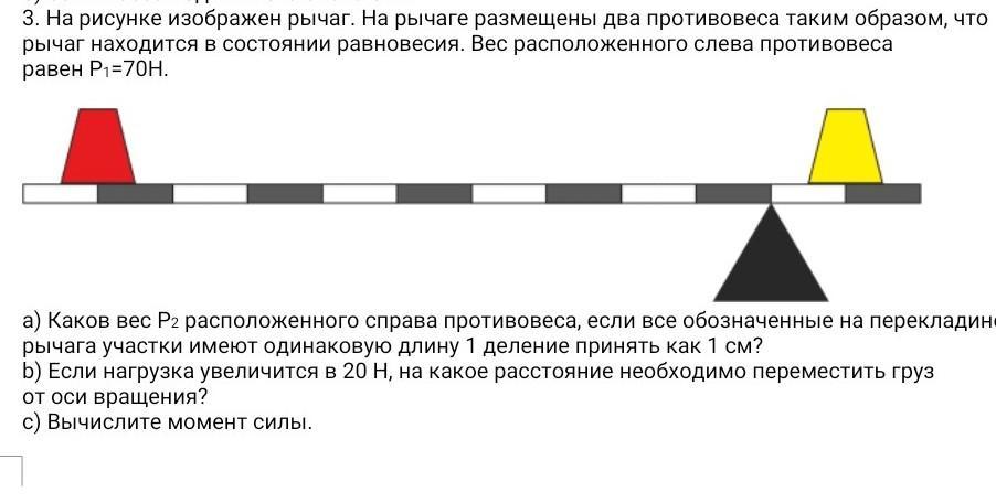 3. На рисунке изображен рычаг. На рычаге размещены два противовеса таким образом, что рычаг находится в состоянии равновесия. Вес расположенного слева противовеса равен P1=70Н.