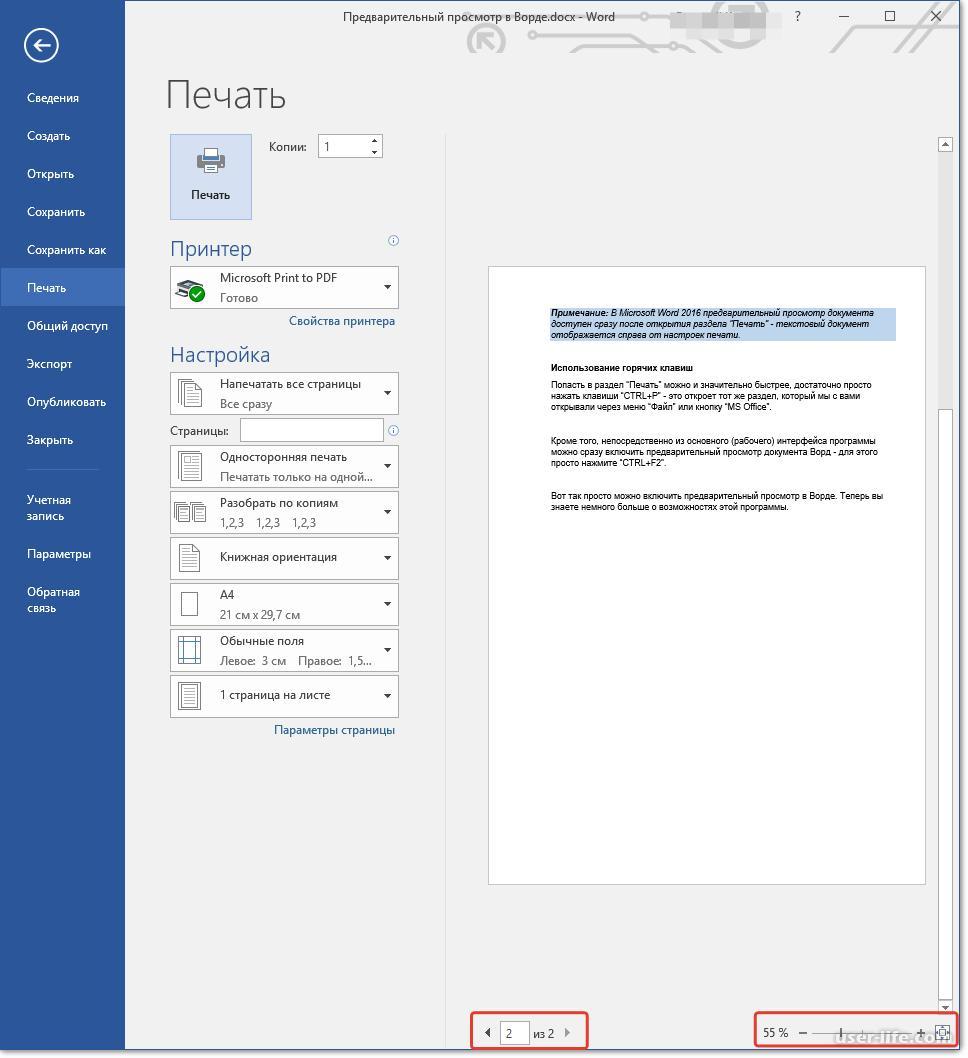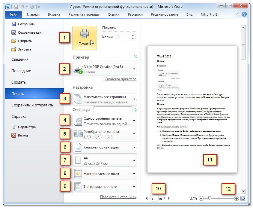 4. Быстрая печать - позволяющая печатать сразу, без предварительной настройки, и если у вас больше одной страницы, то функция напечатает их все. Для её использования необходимо: кликнуть по вкладке Файл, чтобы открыть всплывающее меню. Потом выбрать Печать. Появится панель Печать, слева будут настройки параметров печати, а справа – панель Предварительного просмотра документа. (рис. №1)