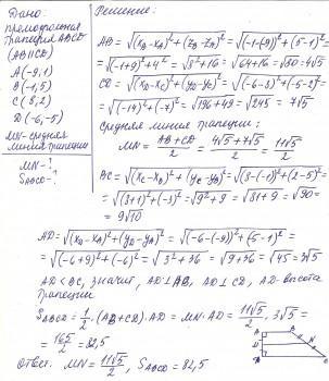 3. Точки А(-9;1), В(-1;5), С(8;2), D(-6;-5) – вершины прямоугольной трапеции с основаниями АВ и CD. Найдите длину средней линии и площадь трапеции