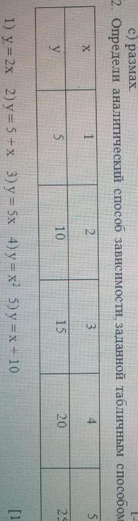 Определите аналитический способ зависимости заданной табличным способом X 12345 Y 5 10 15 20 25 1 игрек равно 2 Икс 2 игрек равно 5 плюс Икс 3 игрек плюс 5 Икс плюс 4 игрек равно икс в квадрате 5 игрек равно икс плюс 10