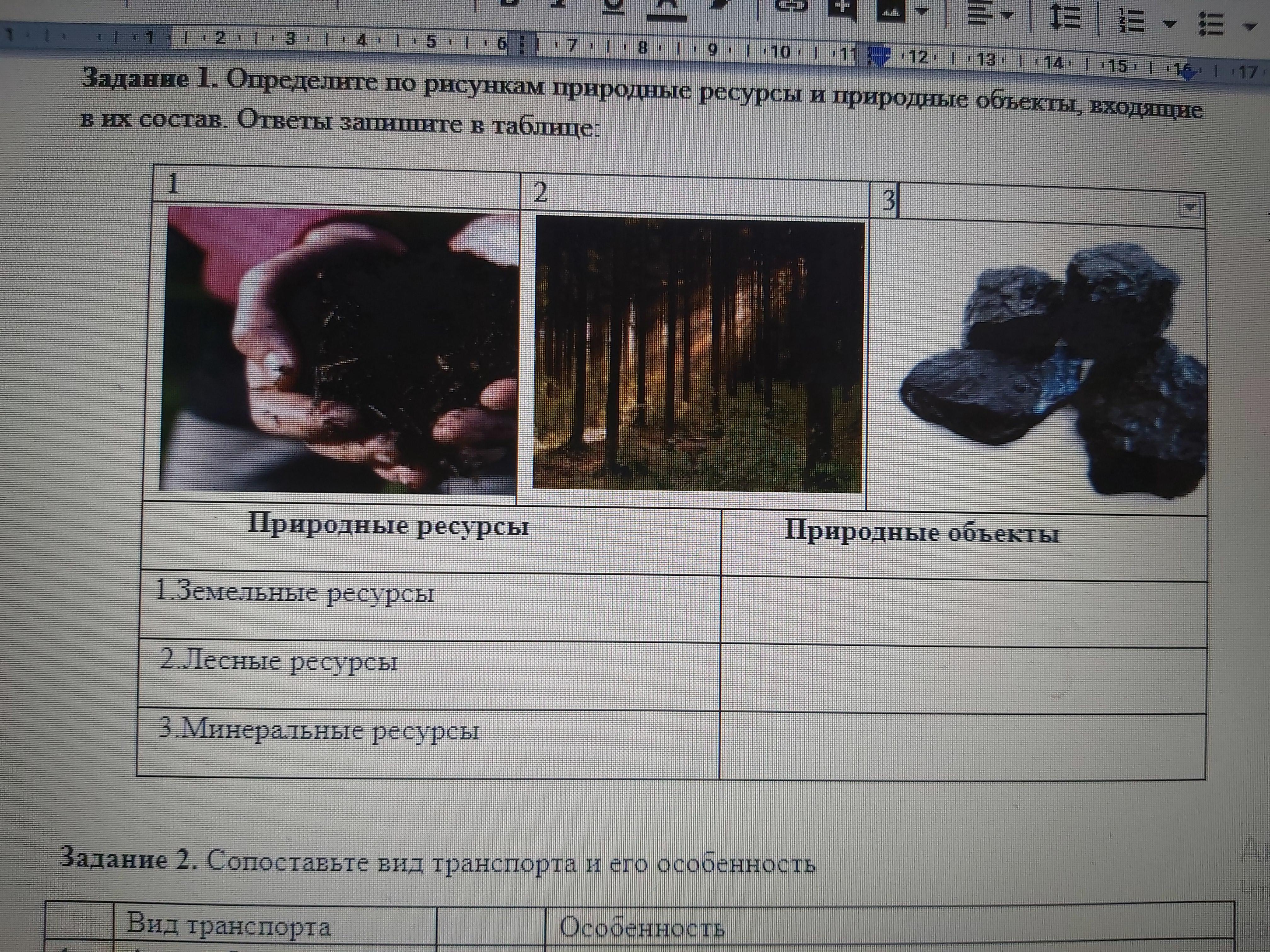 Определите по рисункам природные ресурсы и природные объекты, входящие в их состав. Советы запишите в таблицы