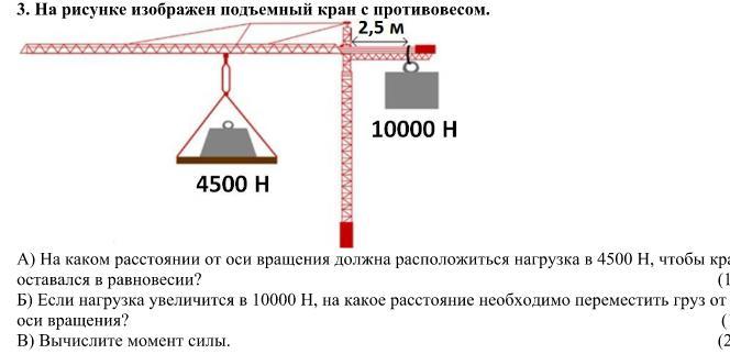 А) На каком расстоянии от оси вращения должна расположиться нагрузка в 4500 Н, чтобы кран
