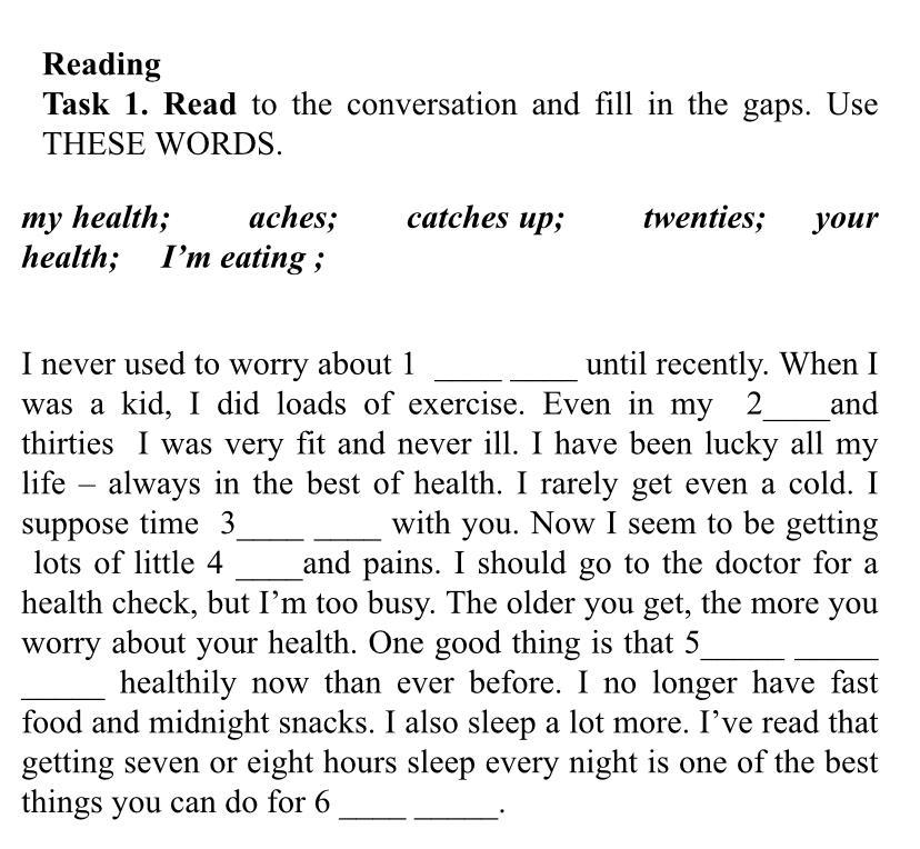 1. My health 2. Twenties 3. Catches up 4. Aches 5. I'm eating 6. Your health