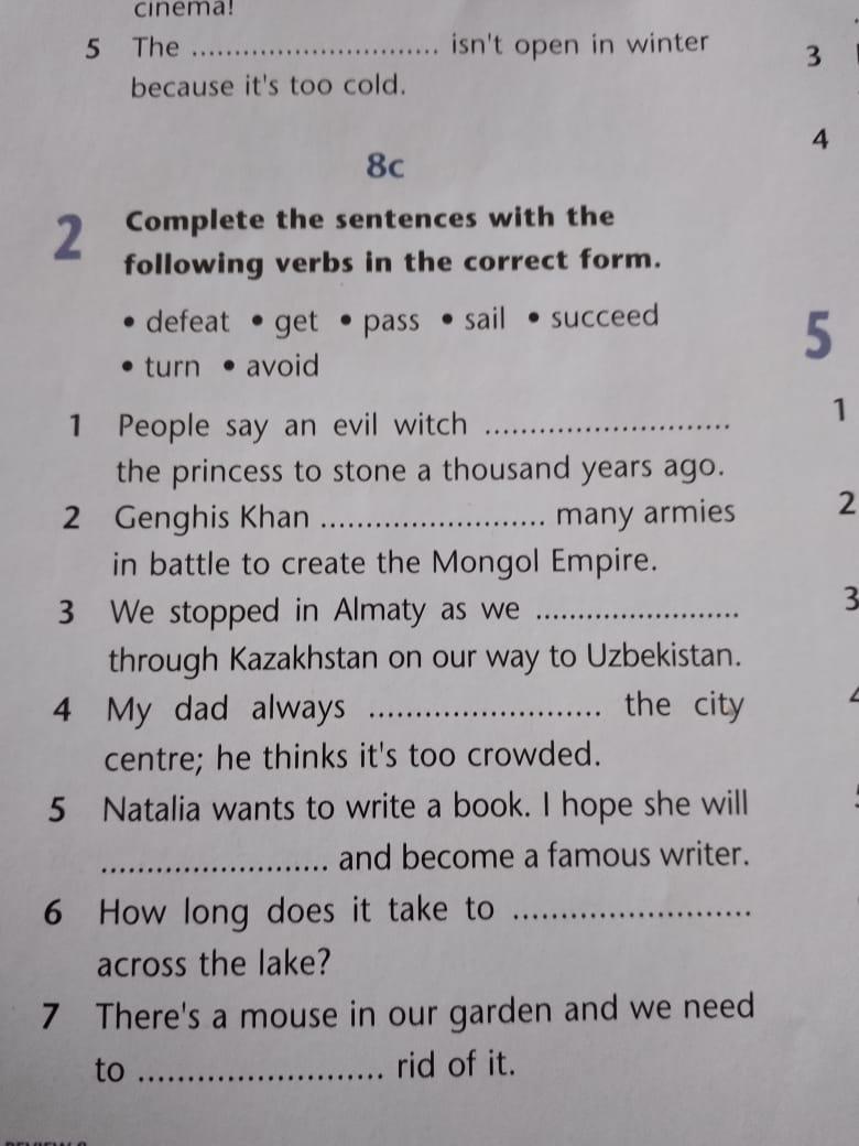 • потерпеть поражение получить успешный ход • повернуть • избежать 1 Люди говорят, что злая ведьма принцесса забила камнями тысячу лет назад. 2 Чингисхана. в битве за создание монгольской империи. много армий ........ Мы остановились в Алматы, поскольку мы через Казахстан на нашем пути в Узбекистан. 4 Мой папа всегда ... ... центр города; он думает, что здесь слишком людно. 5 Наталья хочет написать книгу. Я надеюсь, что она ... и станет известным писателем. 6 Сколько времени нужно, чтобы пересечь озеро? 7 В нашем саду есть мышь, и нам нужно… избавиться от нее. ...