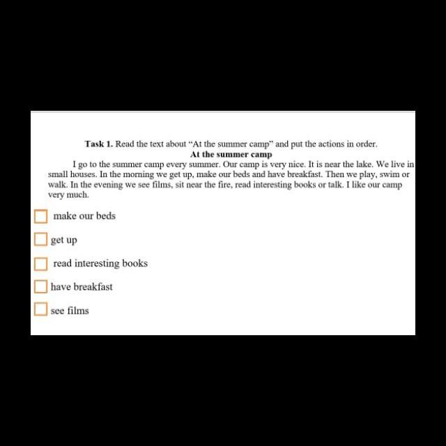 Ответ:1. Get up 2 make our beds 3 have breakfast 4 see films 5 read interesting books