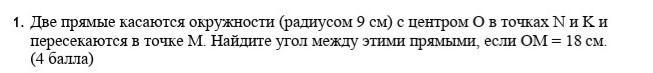 1. Две прямые касаются окружности (радиусом 9 см) с центром О в точках N и K и пересекаются в точке M. Найдите угол между этими прямыми, если ОМ = 18 см.