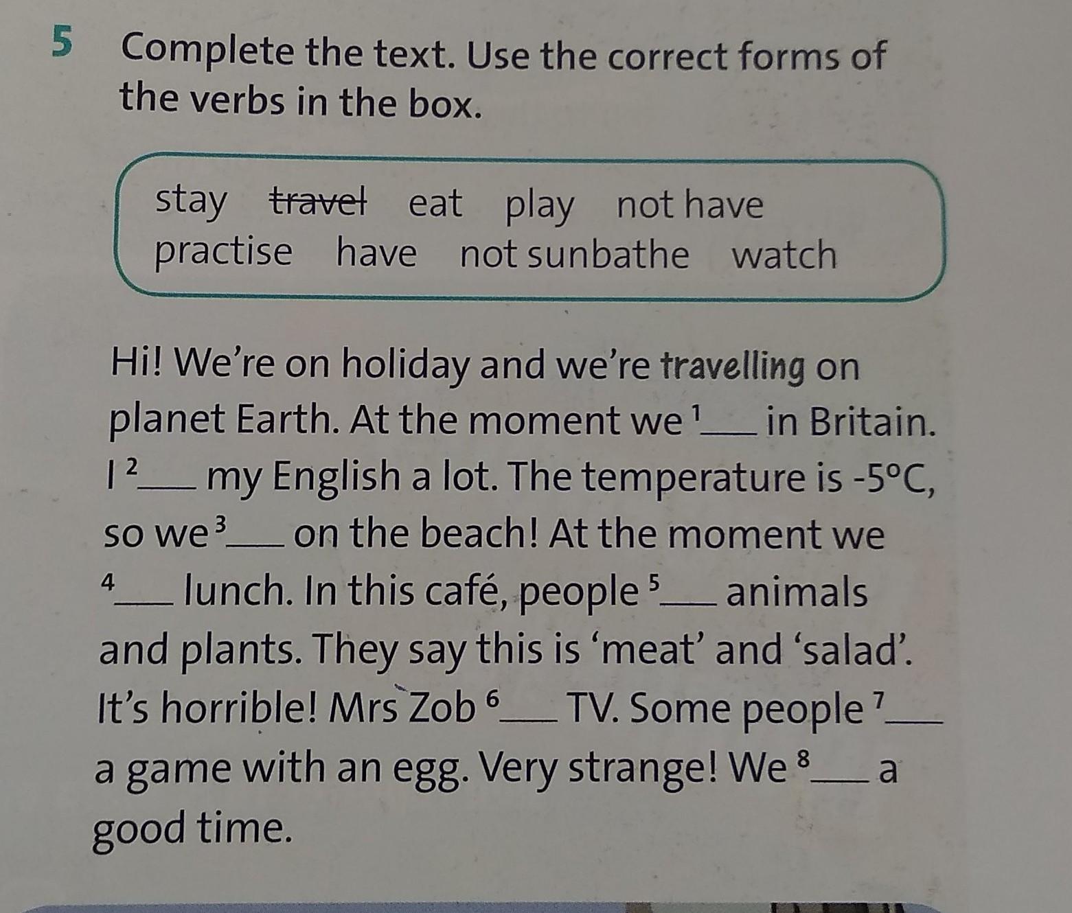 Hi, we re on holiday and we re traveling on planet earth. At the the moment we stay in Britain. I practice my english a lot. The temperature is -5 C, so we not sunbathe on the beach. At the moment we have lunch. In this cafe people eat animals and plants. They say this is "meat" and "salad" this is horrible! Mr Zob watch tv. Some people play a game with an egg. Very strange! We are not have a good time.