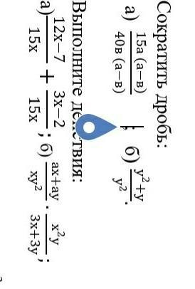 frac{15a(a - b)}{40b(a - b)} =  frac{3a}{8b}   \   frac{y {}^{2}   + y}{ {y}^{2} }  =  frac{y(y + 1)}{ {y}^{2} }  =  frac{y + 1}{y} </p><p> \  \ frac{12x - 7}{15x}  +  frac{3x  - 2}{15x}  =  frac{12x - 7 + 3x - 2}{15x}  =  frac{15x - 9}{15x}  =  frac{3(5x - 3)}{15x}  =  frac{5x - 3}{5x}  \  frac{ax + ay}{x {y}^{2} }  times  frac{ {x}^{2}y }{3x + 3y}  =  frac{a(x + y) times x {}^{2} y}{x {y}^{2}  times 3(x + y)}  =  frac{ax}{3y}