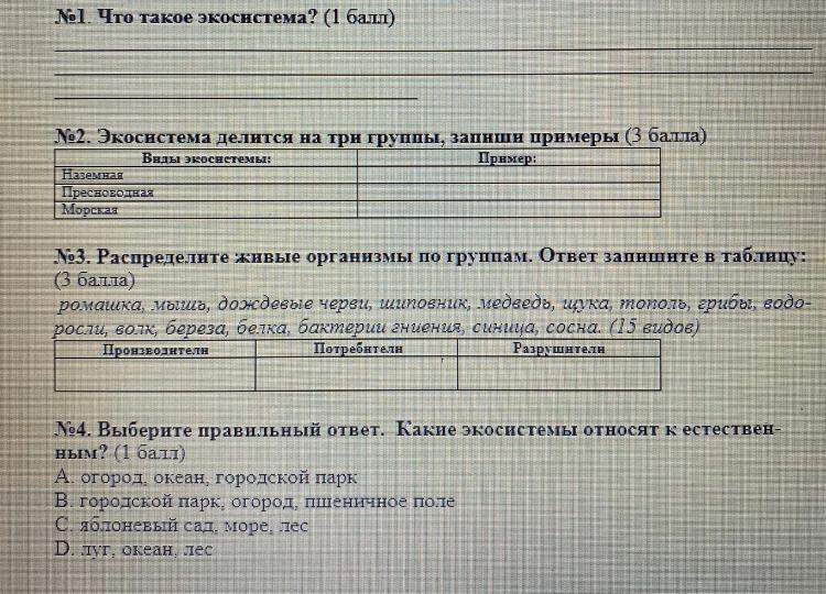 Ответ: экосистема равно биоценоз + биотоп, лес,поле,роща