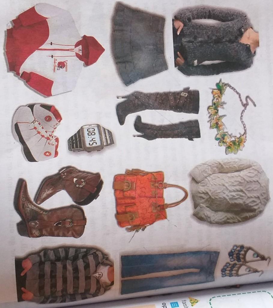 Ответ: кроссовки-sneakers-ˈsniːkərz( составишь сам(а) в правильном порядке)джинсы-Jeans-dʒiːnz,сумка-bag-bæɡ,часы-clock-klɑːk,юбка-skirt -skɜːrt,толстовка-smock-smɑːk,бусы-bead-biːd,свитер- sweater -ˈswetər,блузка или кофта- blouse -blaʊs,обувь -shoes -ˈʃuːz