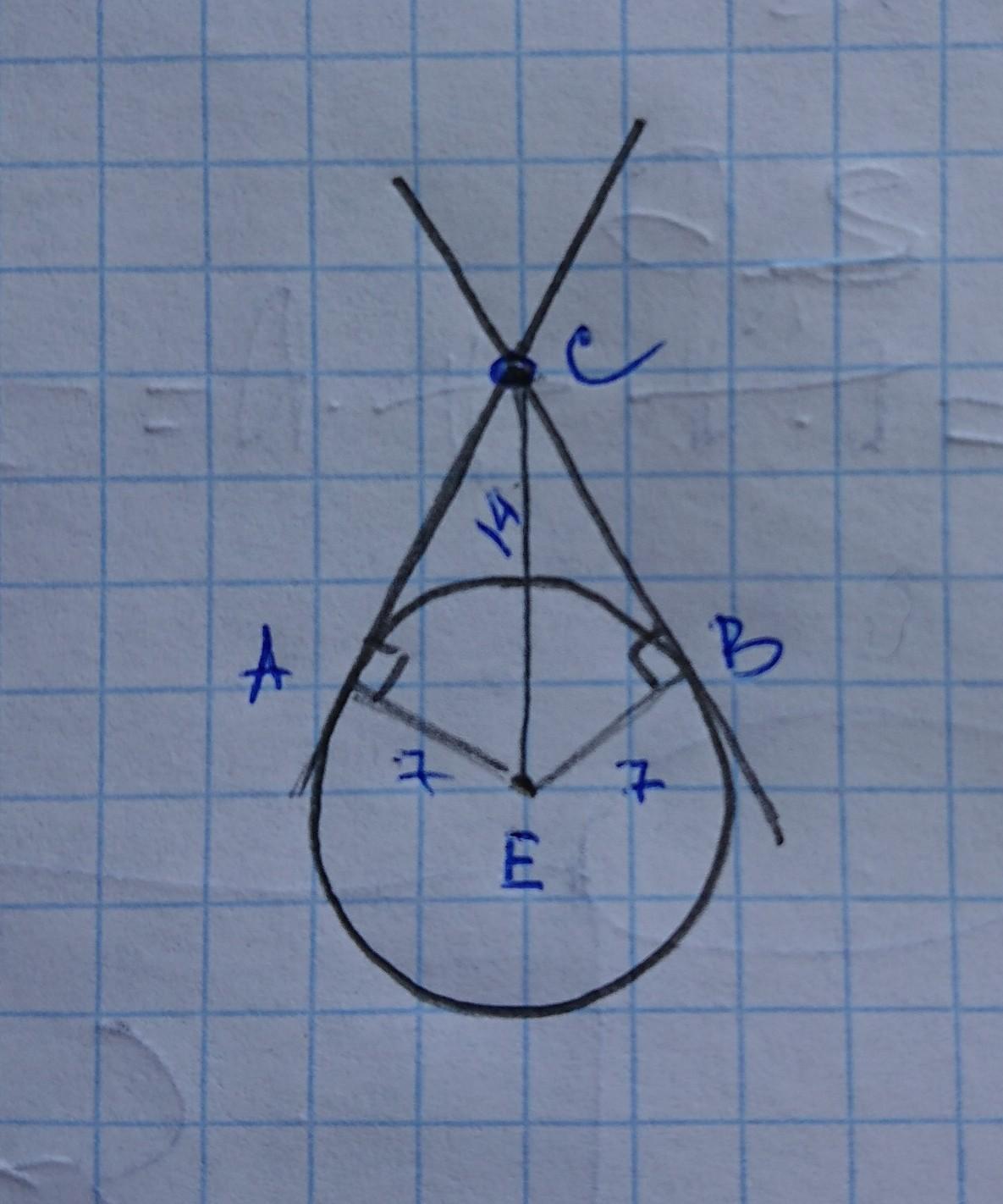 Две прямые касаются окружности (радиусом 7 см) с центром Е в точках А и В и пересекаются в точке С. Найдите угол между этими прямыми, если ЕС 14 см. СРОЧНО НУЖЕН ОТВЕТ !!!!!!!