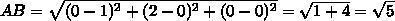 АВ=✔(0-1)²+(2-0)²+(0-0)²=✔1+4=✔5