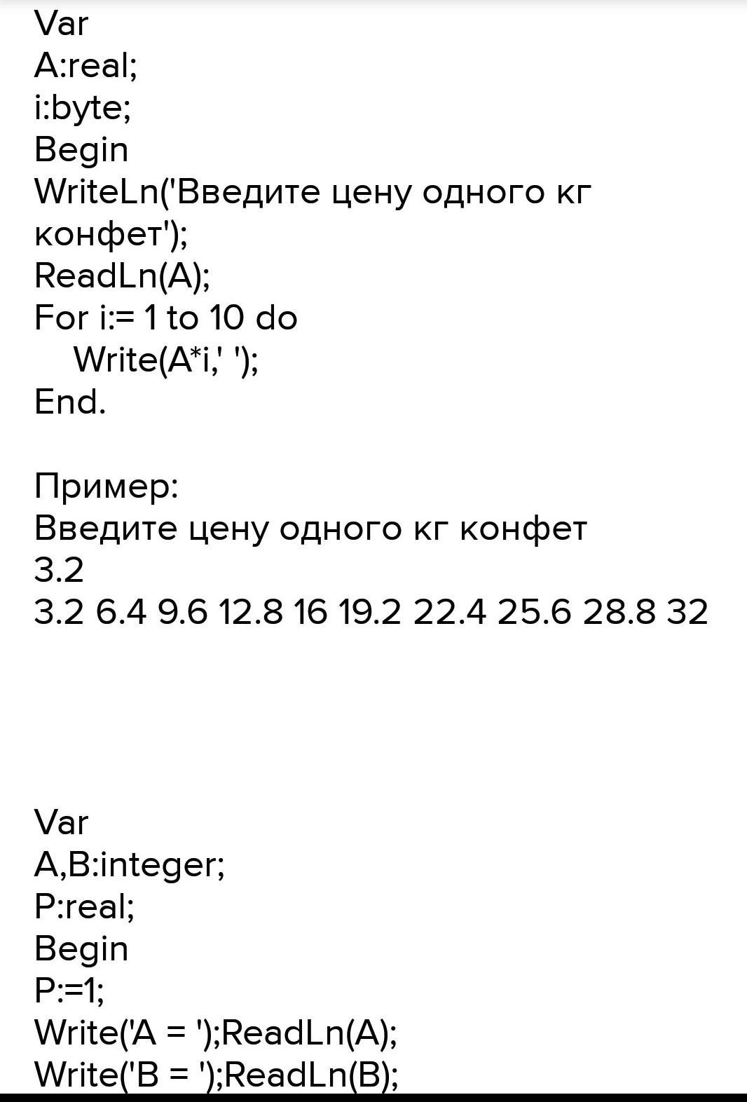 1) Дано целое число — цена 1 кг конфет. Вывести стоимость 1, 2, …, 10 кг конфет.