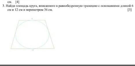 Найди площадь круга вписанного в равнобедренную трапецию с собой основаниями длиной 6 см и 12 см и перимеиром 36 см. Пожалуйста помогите