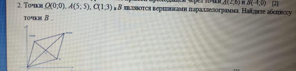 точки о(0 0) а(5 5) с(1 3) и B является вершинами параллелограмма. Найдите абсциссу точки B