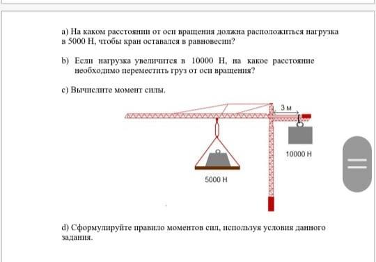 на рисунке изображен кран с противовесом. а) на каком расстоянии от оси вращения должна расположиться нагрузка в 5000 н, чтобы кран оставался в равновесии? b) если нагрузка увеличится в 10000 н, на какое расстояние необходимо переместить груз от оси вращения? с) вычислите момент силы. d) сформулируйте правило моментов сил используя условия данного задания.